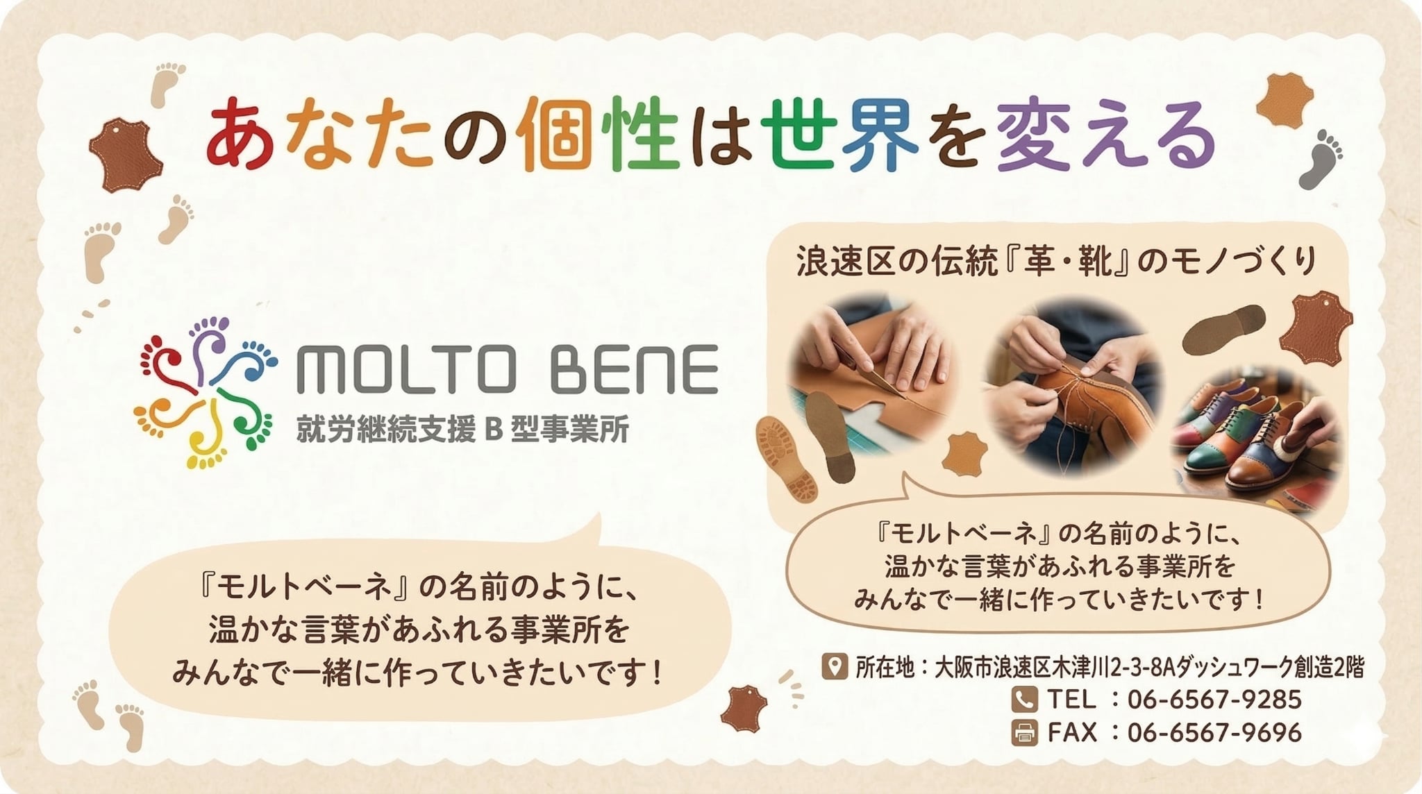 地場産業である革・靴に特化した就労継続支援B型事業所を開設し、先人たちが紡いで頂いた文化を新しい形で発信。就労移行まで全力応援します。https://www.instagram.com/moltobene_shoe/