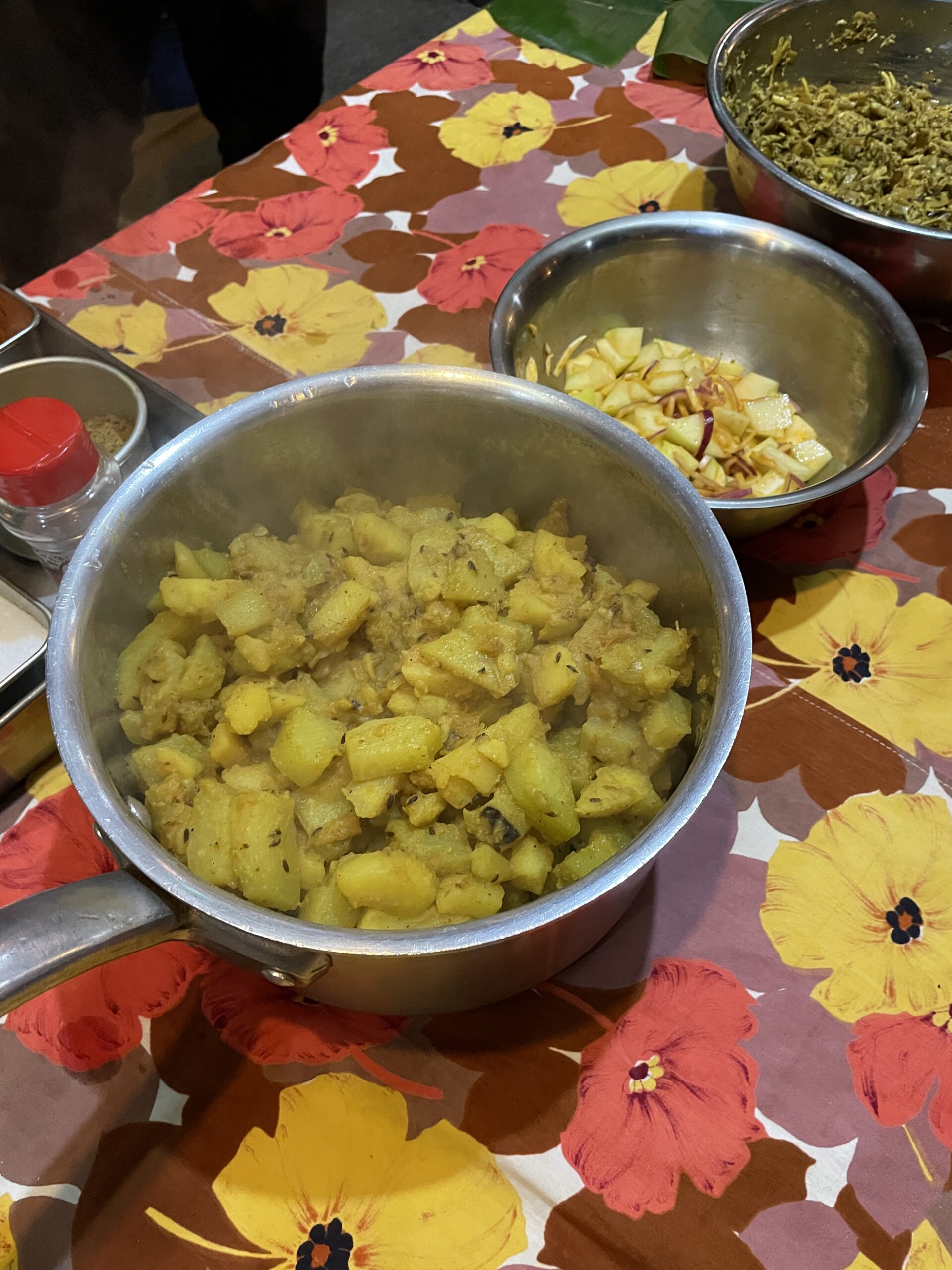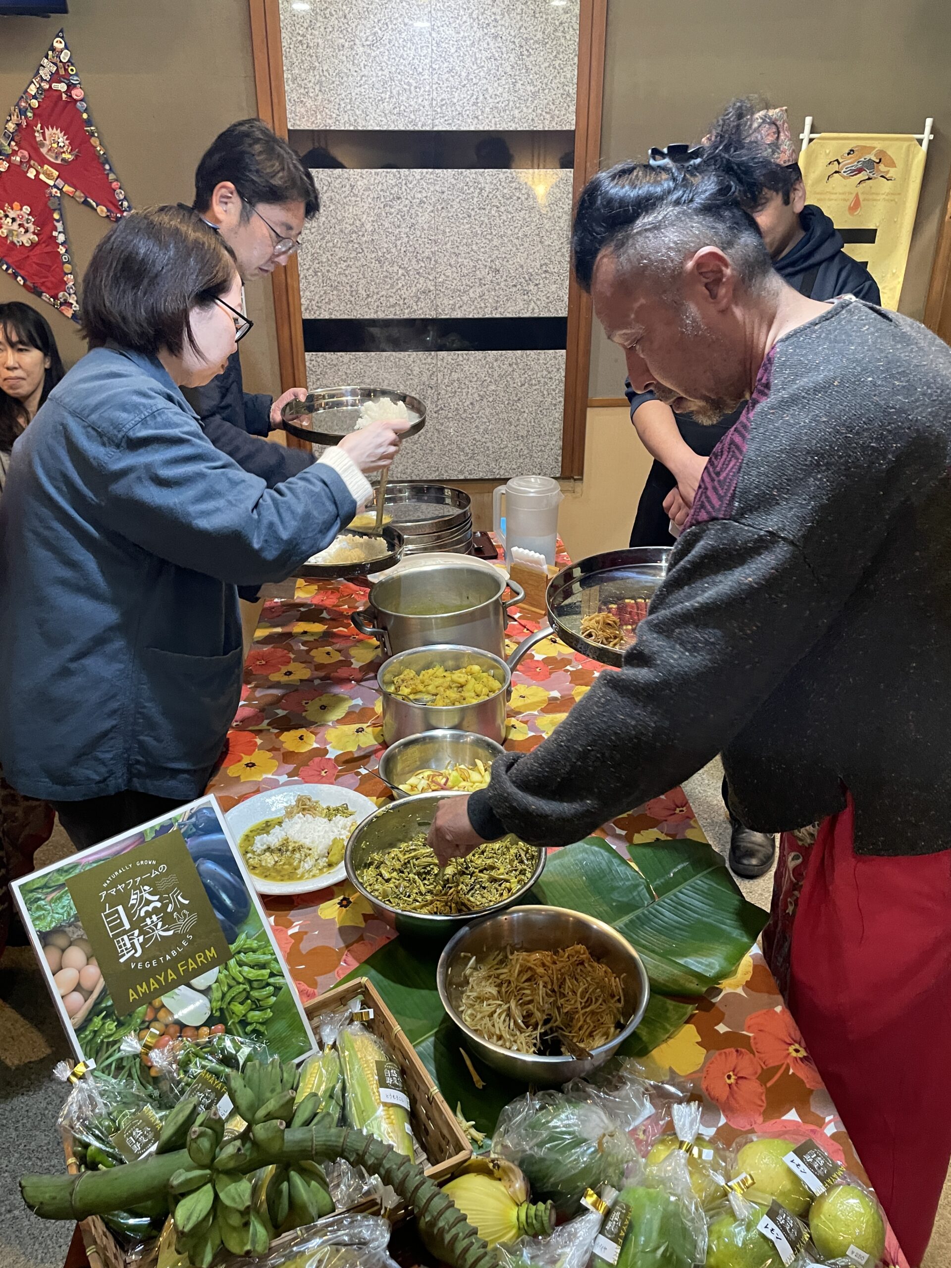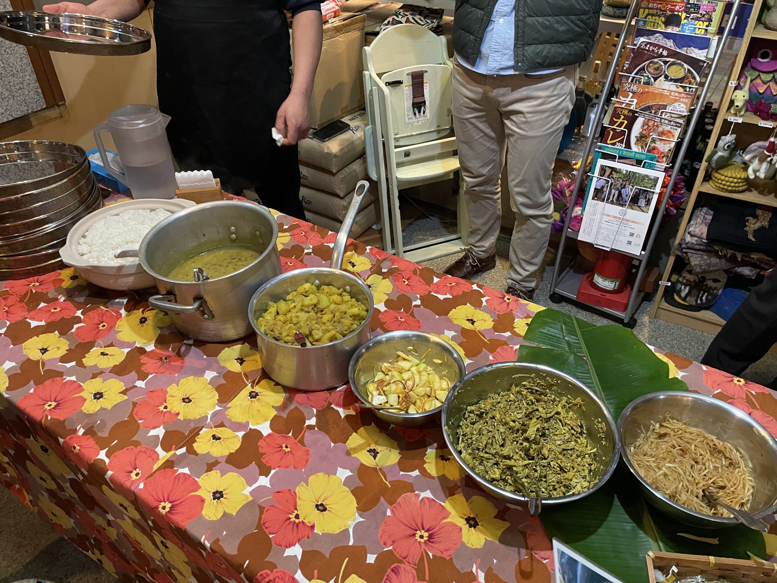 全ての料理が完成した後には、今回作り方を紹介した珍野菜を使ったネパールのごはんのお供たちを、ビュッフェ形式でごはんと一緒にお皿に盛り付けし、食べました。