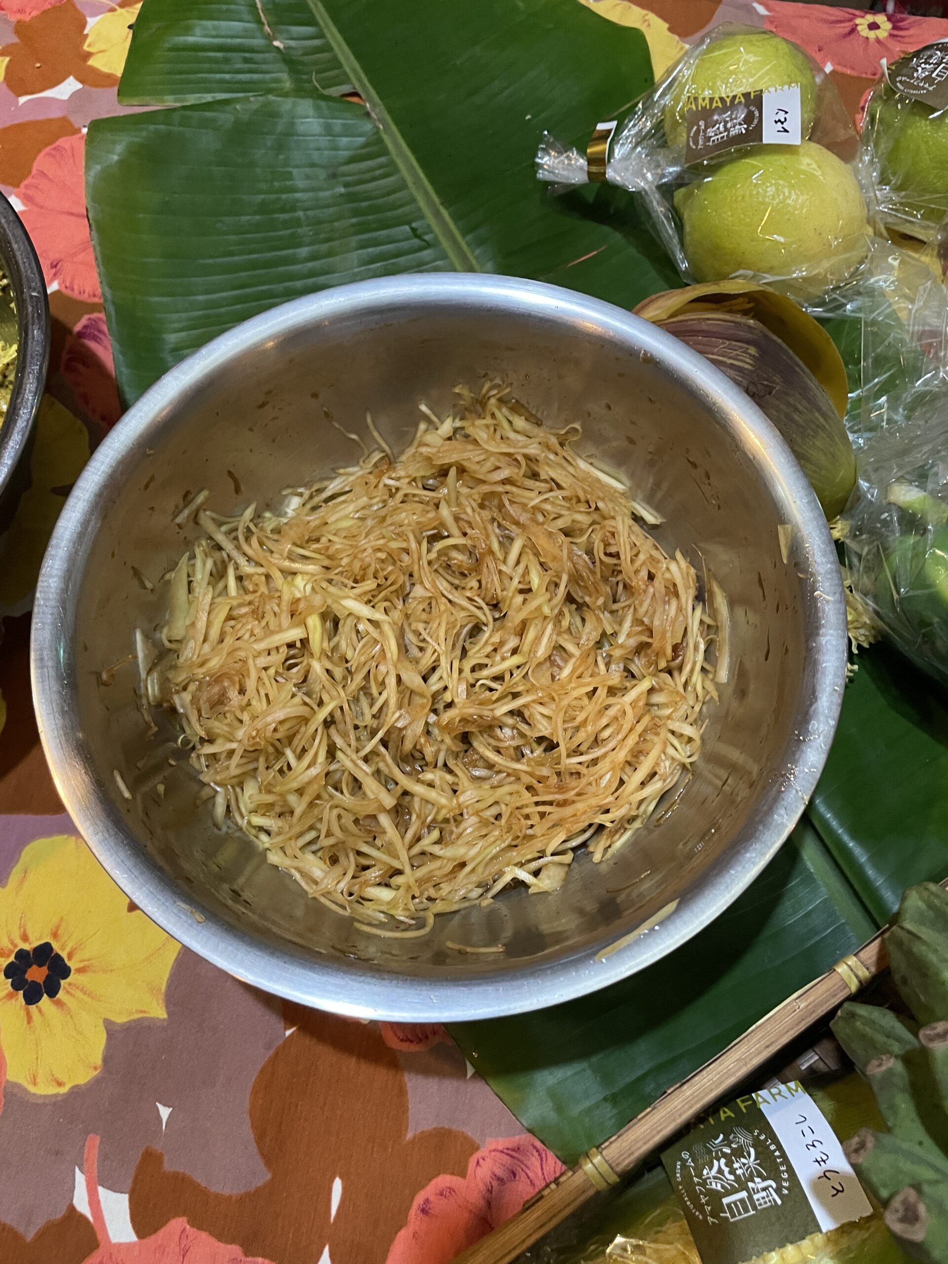 ゆでた花と皮が用意してあり、そこに塩、すりごまを入れて混ぜます。その後、鍋に油を入れてフェヌグリークという黄色く固いメープルシロップに似た甘い香りと苦みのある種を熱します。バナナの花と皮にターメリックをかけ、ターメリックにかかるように熱した油を注ぎ入れ、混ぜ合わせたら完成です。