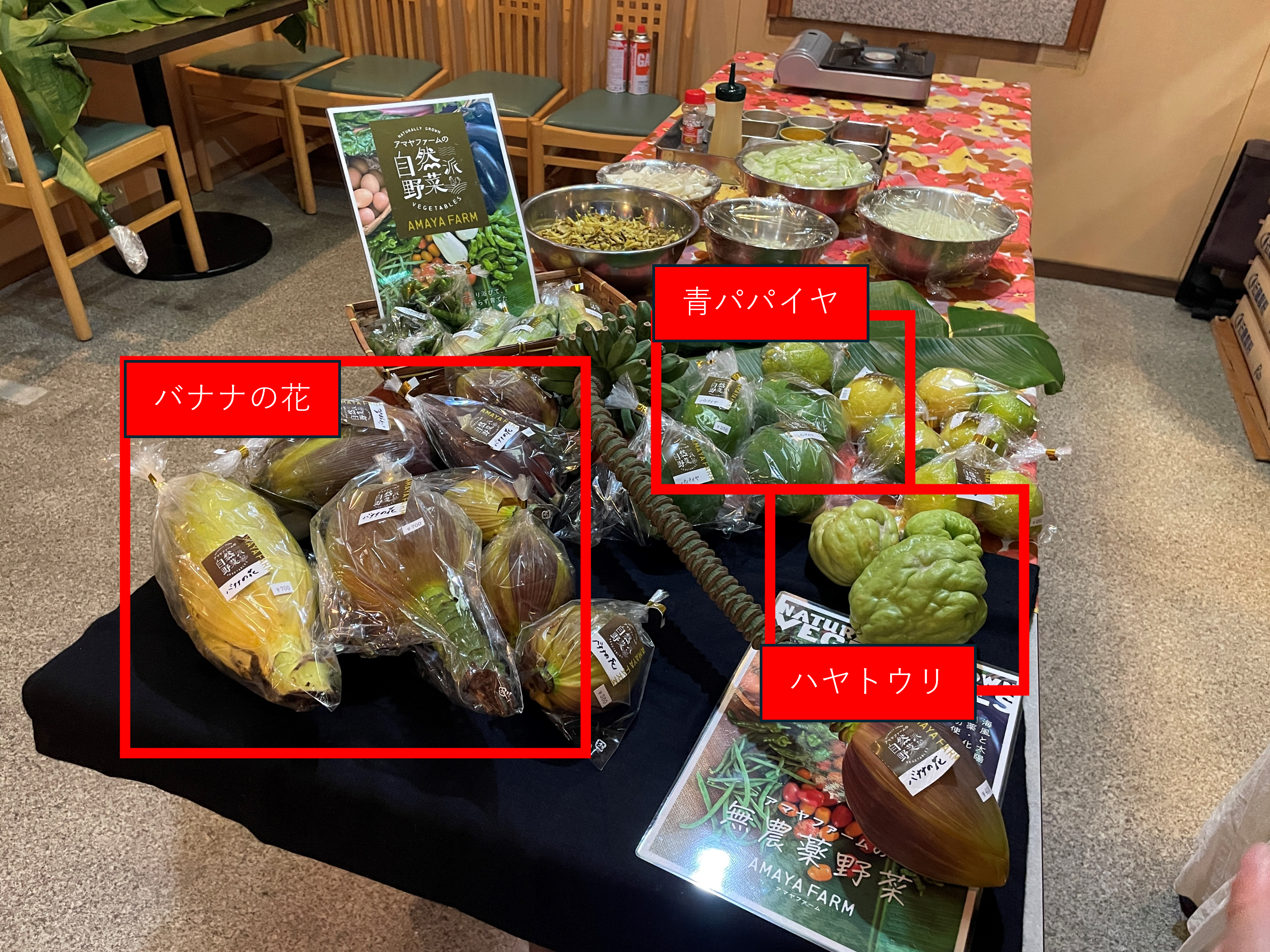 今回使う食材は、ハヤトウリ、青パパイヤ、バナナの花の3種類です。