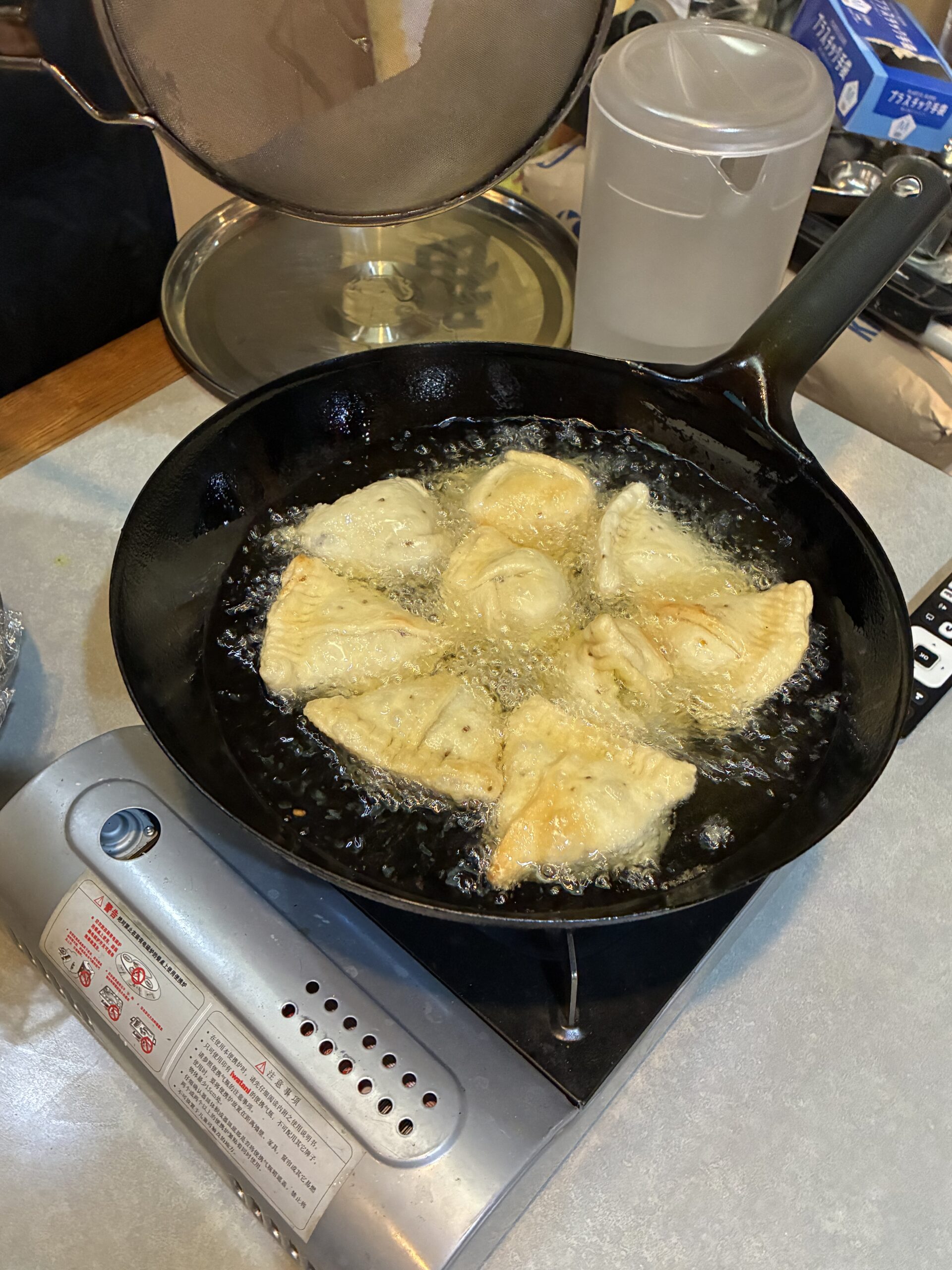 そして、低温の油でじっくり揚げていきます。じっくり揚げることで生地がパイ生地のようにパリパリ食感になります。意外と生地が厚く、パンにも似た食感になります。